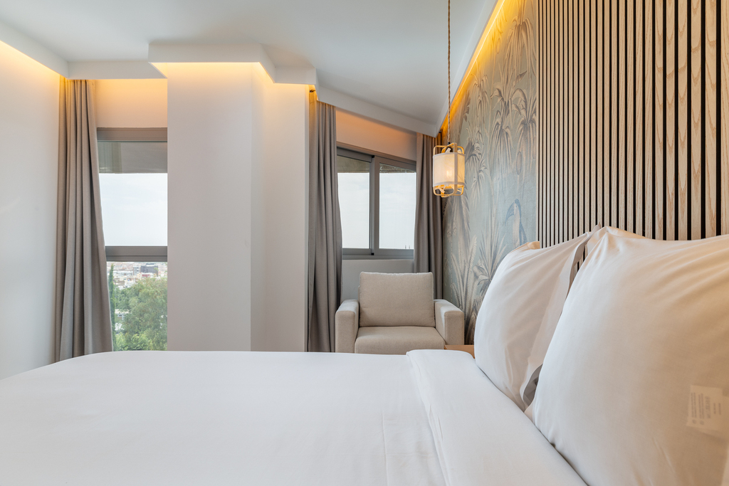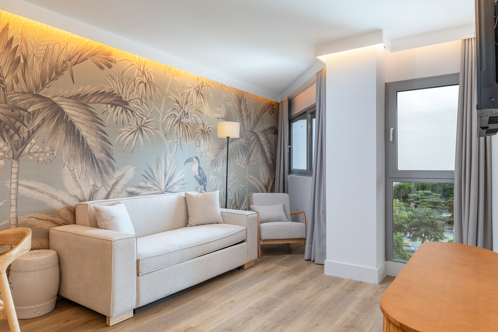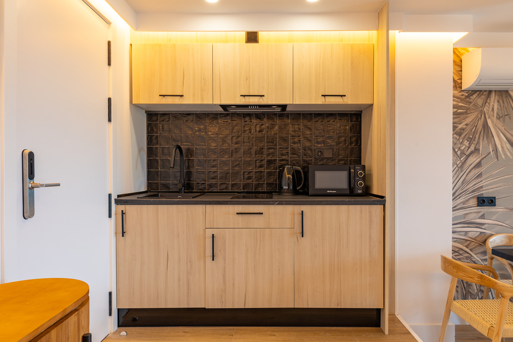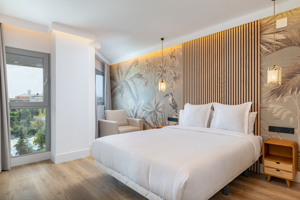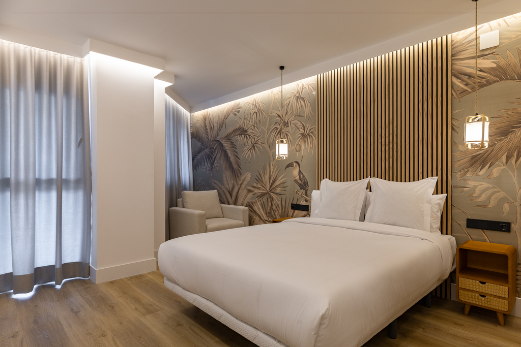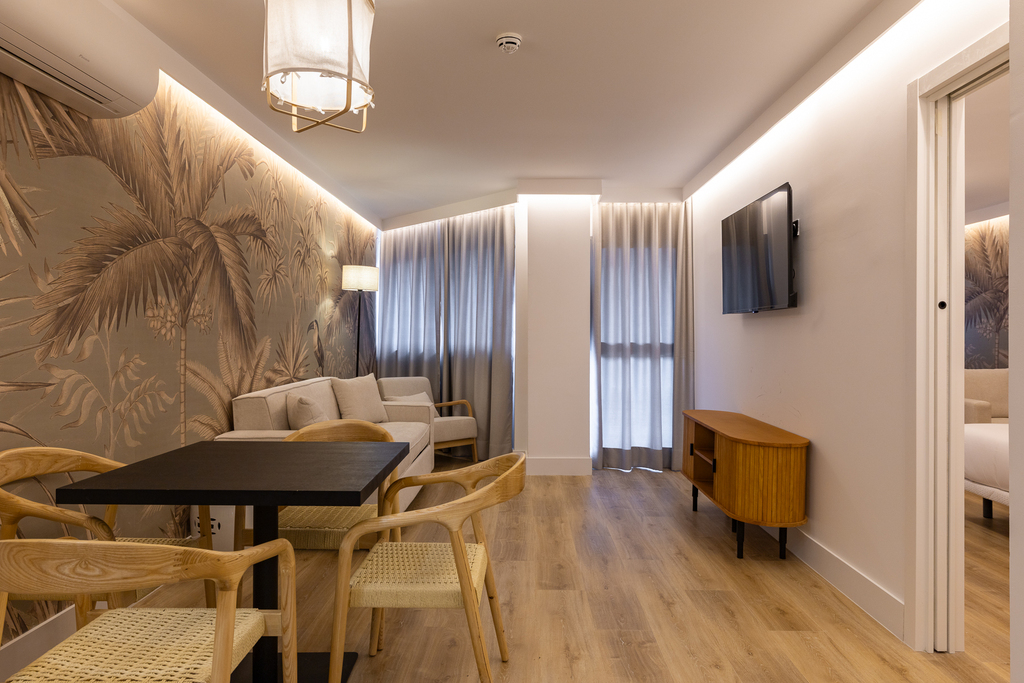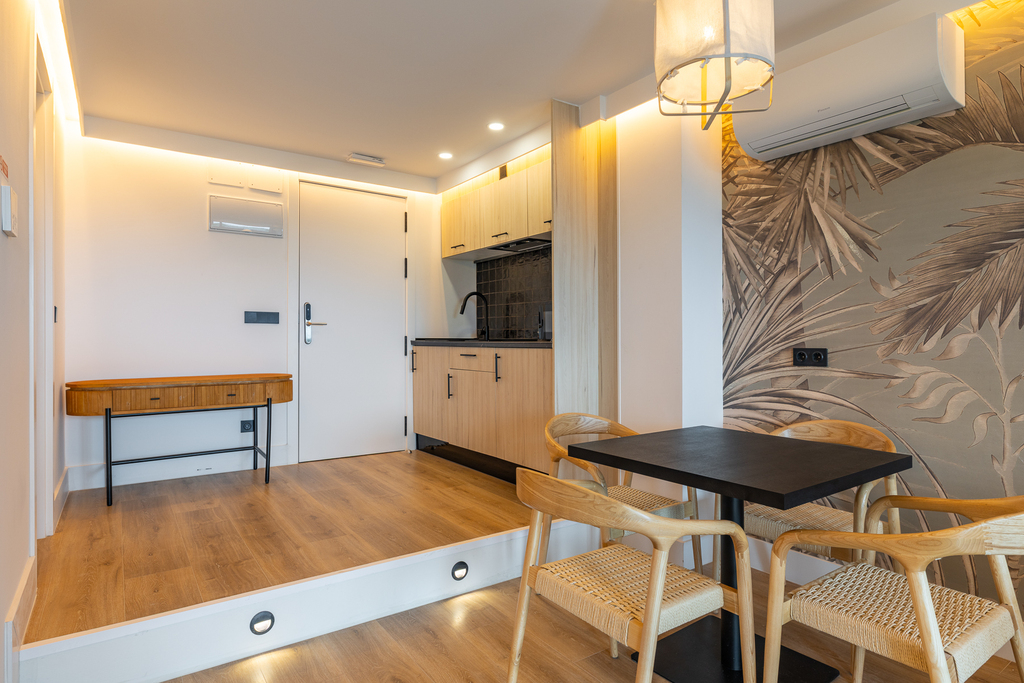 La suite doble estándar es un espacio diseñado para ofrecer comodidad y practicidad. Decorado con un estilo nórdico de ambiente acogedor, se divide en dos espacios, uno de ellos con cocina, una zona de estar perfecta para relajarse o recibir visitas y un baño de diseño totalmente equipado y otro espacio dormitorio con una cama de matrimonio que garantiza un descanso reparador. En general, estas suites son ideales para estancias prolongadas, ya que brindan la flexibilidad de tener un espacio para relajarse y desconectar.