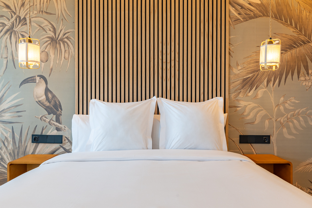 Cama con cabecero de madera, paredes con mural de ave y hojas, y luminaria moderna.