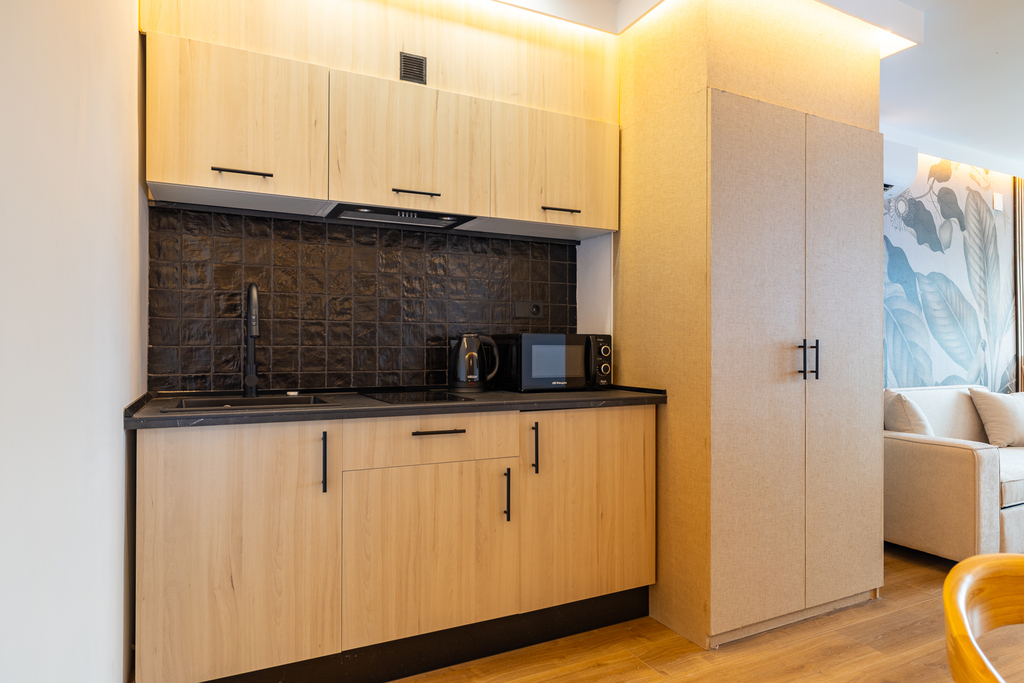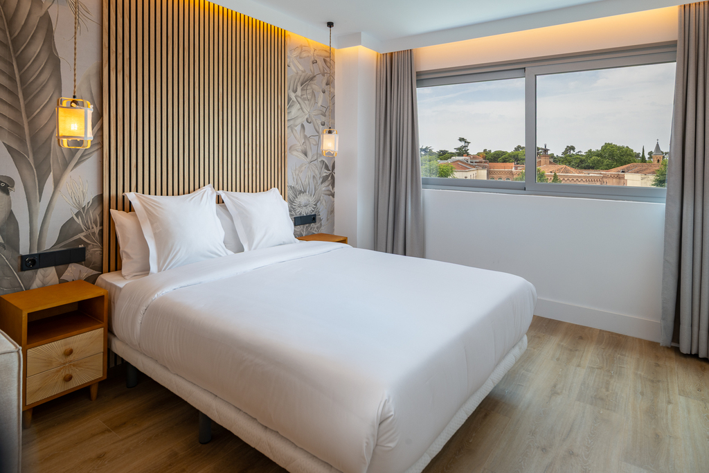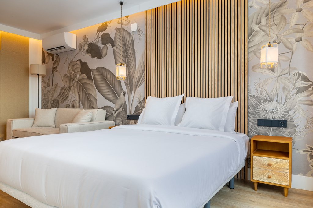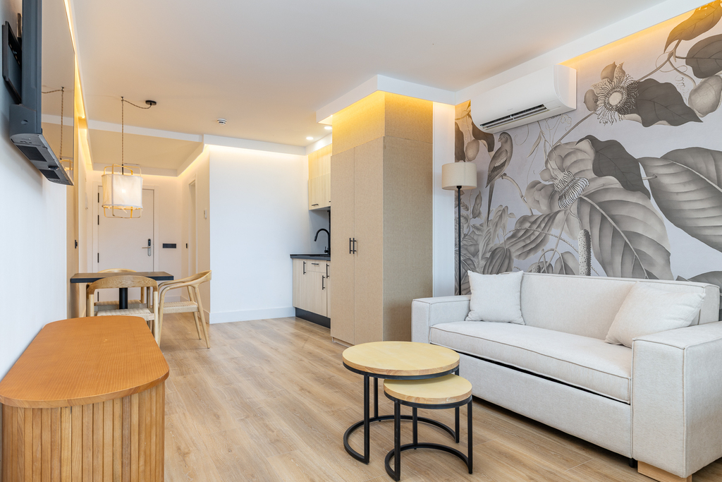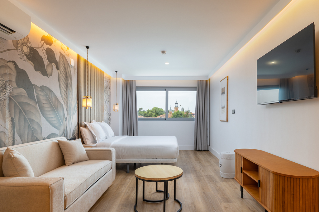 La suite junior es un espacio diáfano diseñado para ofrecer comodidad y practicidad. Se unen tres áreas en un espacio con cocina que cubre las necesidades del viajero; zona de estar acogedora para relajarse o recibir visitas que sirve de salón durante el día y como zona de descanso por la noche. El dormitorio con cama de matrimonio garantiza un descanso reparador. Baño de diseño totalmente equipado. En general, estas suites son ideales para estancias prolongadas, ya que brindan la flexibilidad de tener un espacio para relajarse y desconectar.