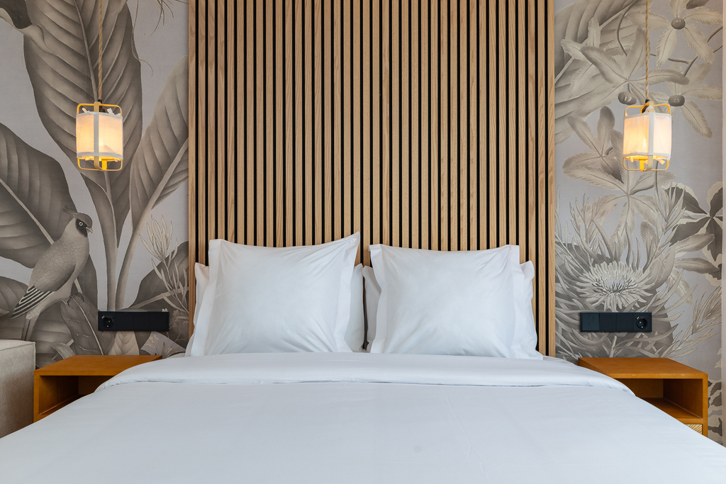Cama con cabecero de madera, paredes con mural de ave y hojas, y luminaria moderna.